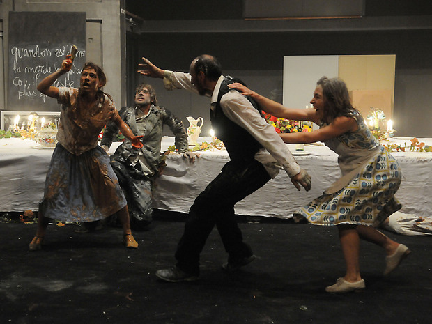 Des tables sont mises et desservies à des époques différentes, des estrades montées et démontées au rythme des cris d'un maître d'œuvre qui passe les planches qui passent à la chaine dans les mains des Danseurs Acteurs qui les posent au fur et à mesure.